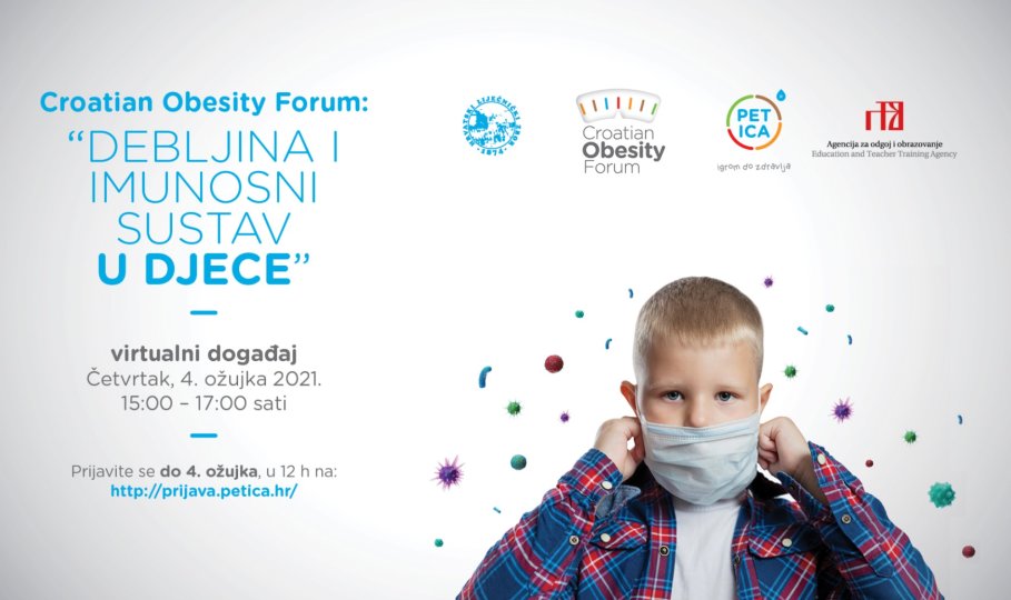 Hrvatski liječnički zbor u sklopu programa PETICA – igrom do zdravlja i Agencija za odgoj i obrazovanje vas poziva na već tradicionalni, četvrti po redu Croatian Obesity Forum. Forum će se održati povodom Svjetskog dana debljine, 4. ožujka 2021., u virtualnom formatu, od 15:00 do 17:00 sati.